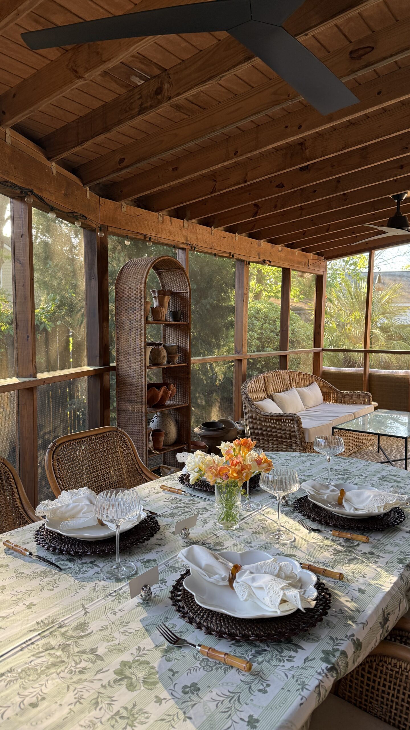 My first tablescape out on the new screen porch! I love this tablecloth and napkin combo (both from Tuckernuck!) I wasn’t sure about being under a porch versus being outside at first–but I’ve already decided I’m going to love being bug-free come summer.