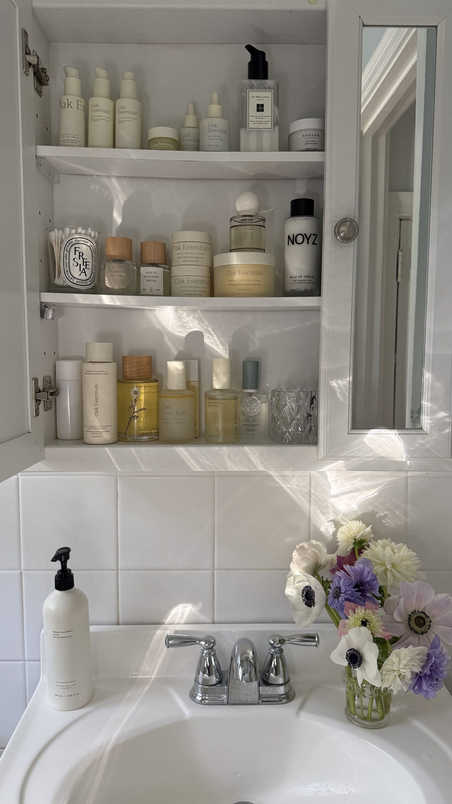 Medicine cabinet looking cute! Oak Essentials has taken over my beauty routine–I use the face products sparingly (I have extremely sensitive skin), but am beyond hooked on the body care. The scrub, lotion, body butter and sunscreen are all favorites. I also just started using this hand soap and it is the most intoxicating smell!