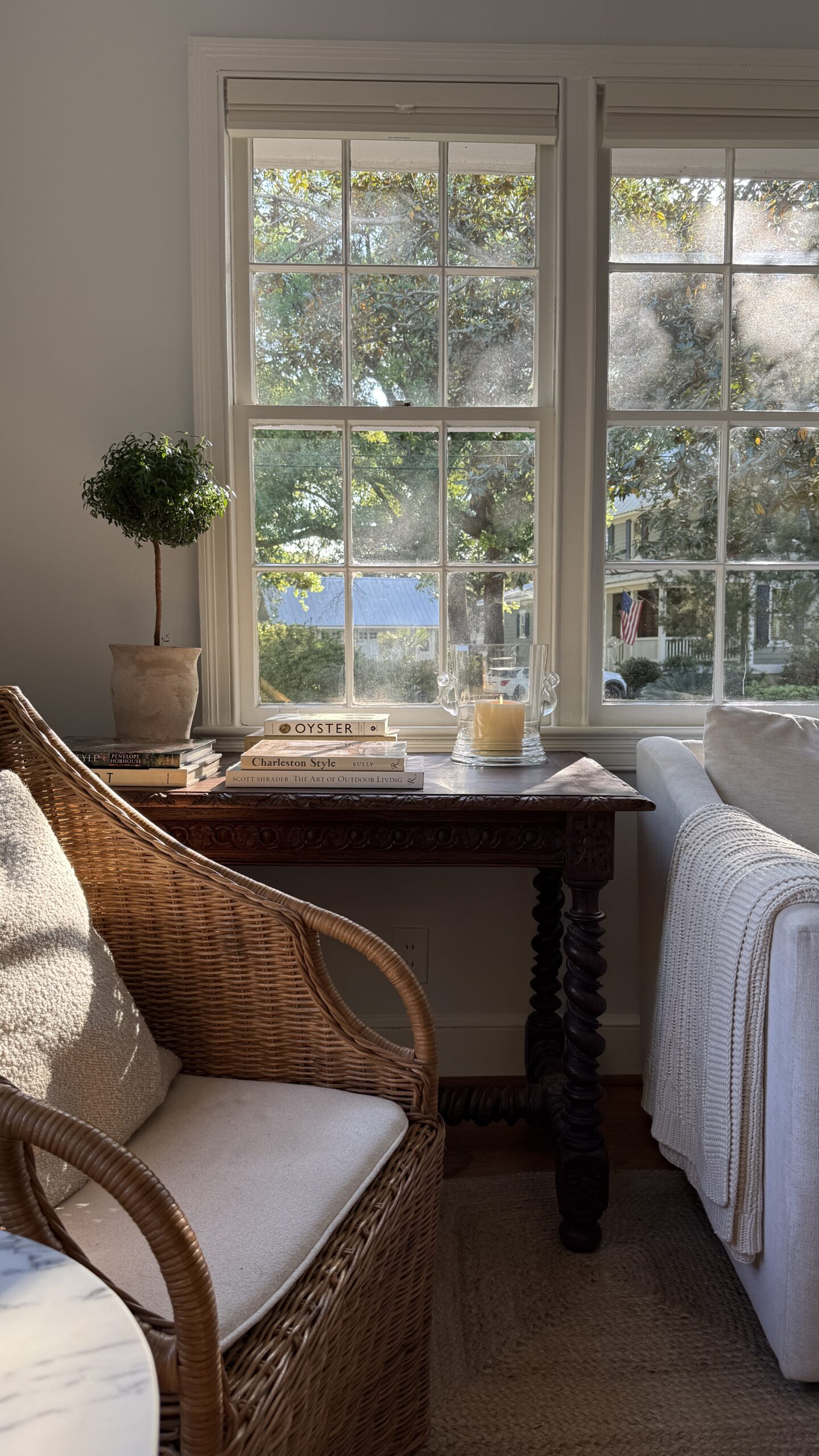 I actually can’t believe these pictures are of my house–I don’t think I’ll ever get over the big beautiful window and natural light in this home! My major vintage score from the Digs Charleston Warehouse Sale completely set the tone for this room. It is a either sixteen or eighteen-hundreds Jacobean hand-carved oak table… DREAM. So many of the photos I have saved on Pinterest have a table just like this and I’m still pinching myself that I now have one, too.