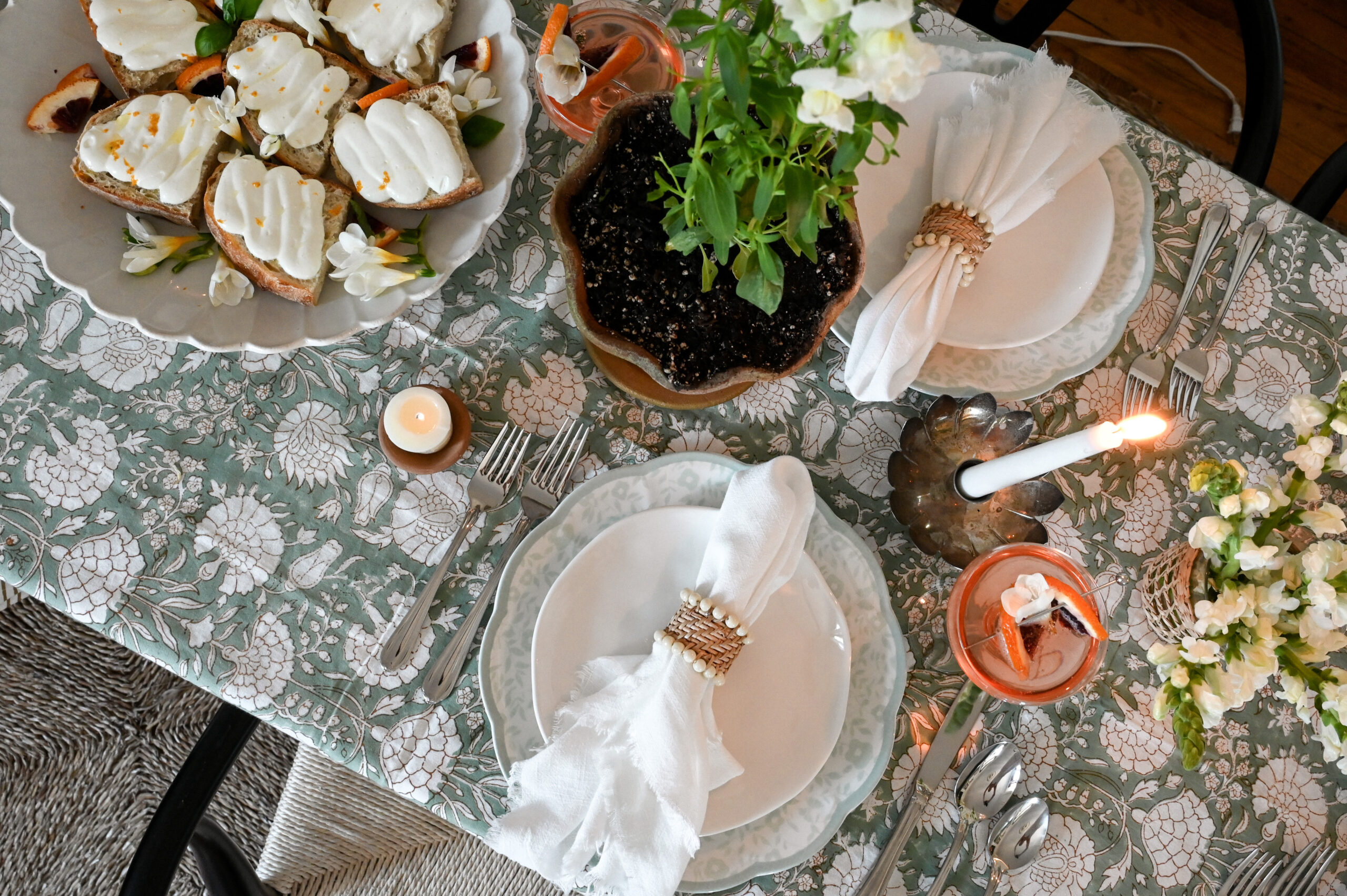 As I’ve been awaiting the arrival of the warmer months, I’ve been injecting my home with beautiful summer decor, adding a extra bit of color and joy. I love curating a beautiful tablescape to match the mood of the season, incorporating dainty details, such as block-print floral tablecloths, beautiful woven napkin rings, delicately patterned plates, and sleek glassware. It’s the little touches that bring a table setting all together–the sweet melon detail on the flatware perfectly brings an element of summer to the table. See below for a variety of ideas to give your summer table something extra this summer!