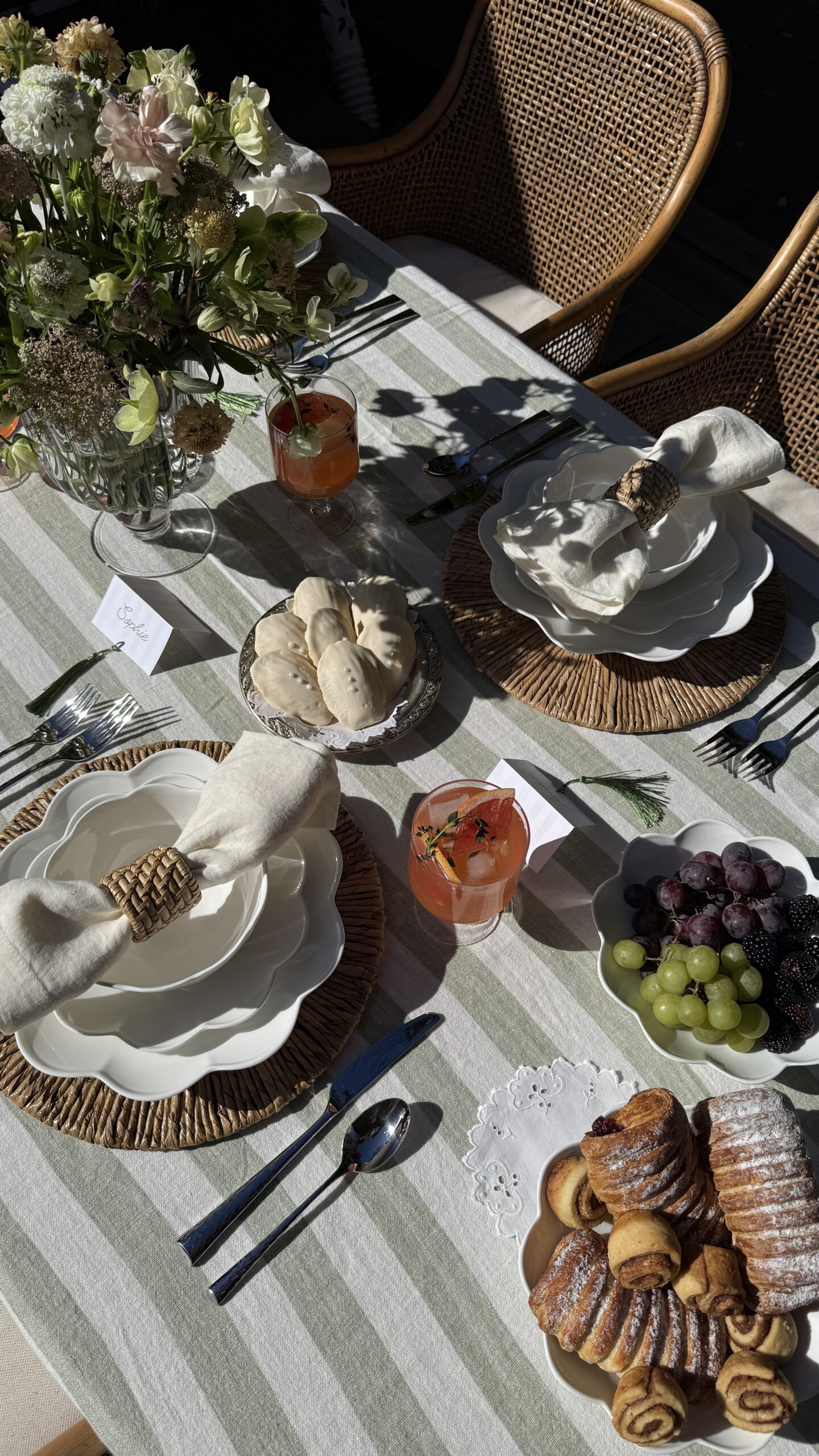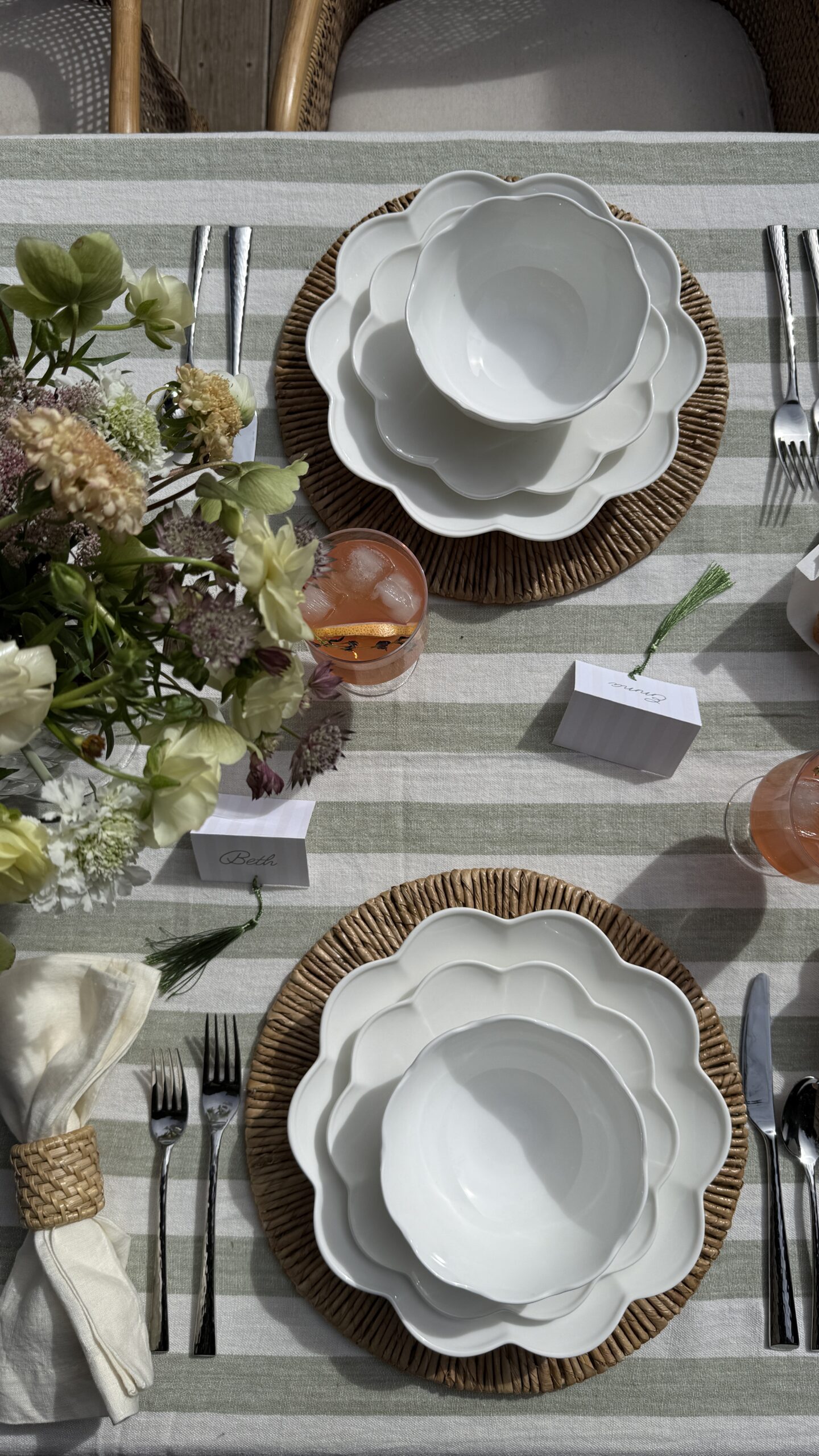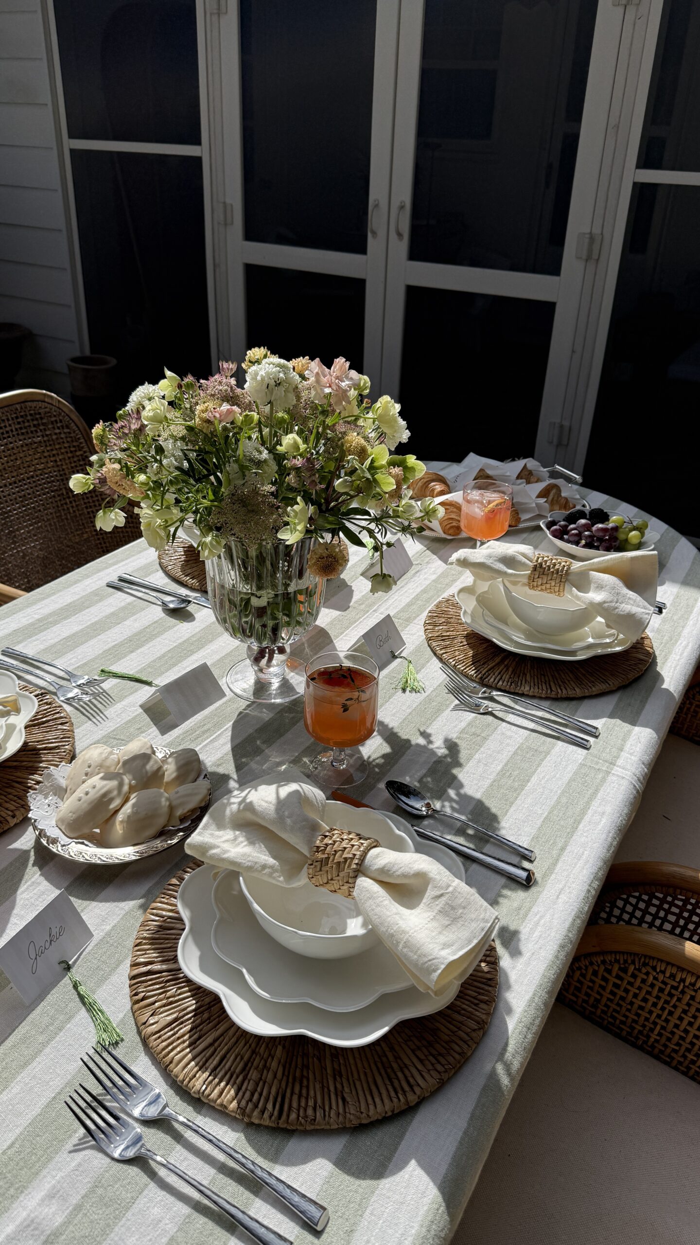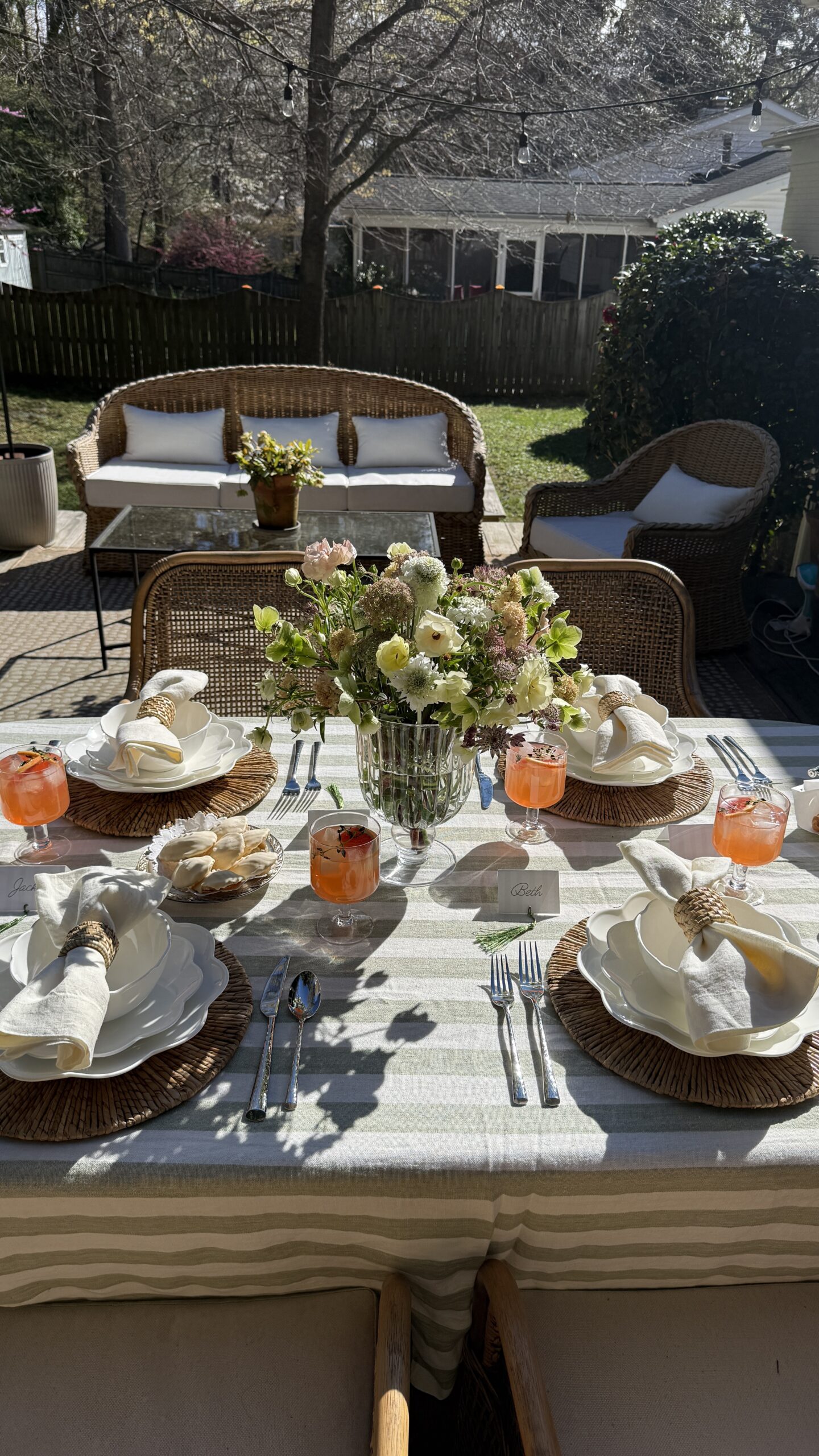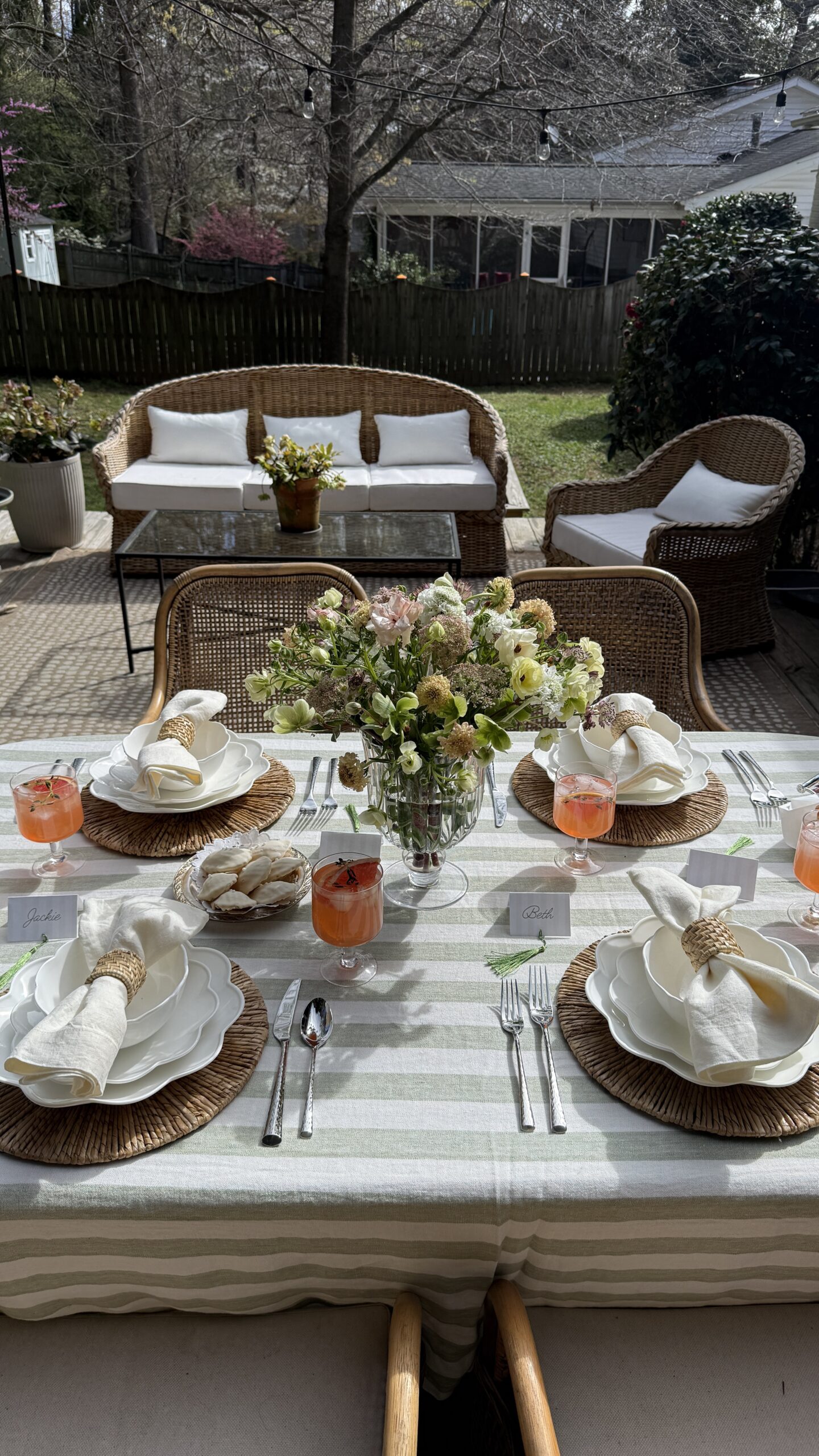 Before leaving my Raleigh home, I wanted to put together one last springtime brunch on my back porch. It was inspired around this new-in dinnerware set from Lenox–I fell in love with the scalloped detailing! I’ve also been wanting for a reason to use this stunning striped tablecloth–I think it’s such a spring/summer staple and the quality is amazing!