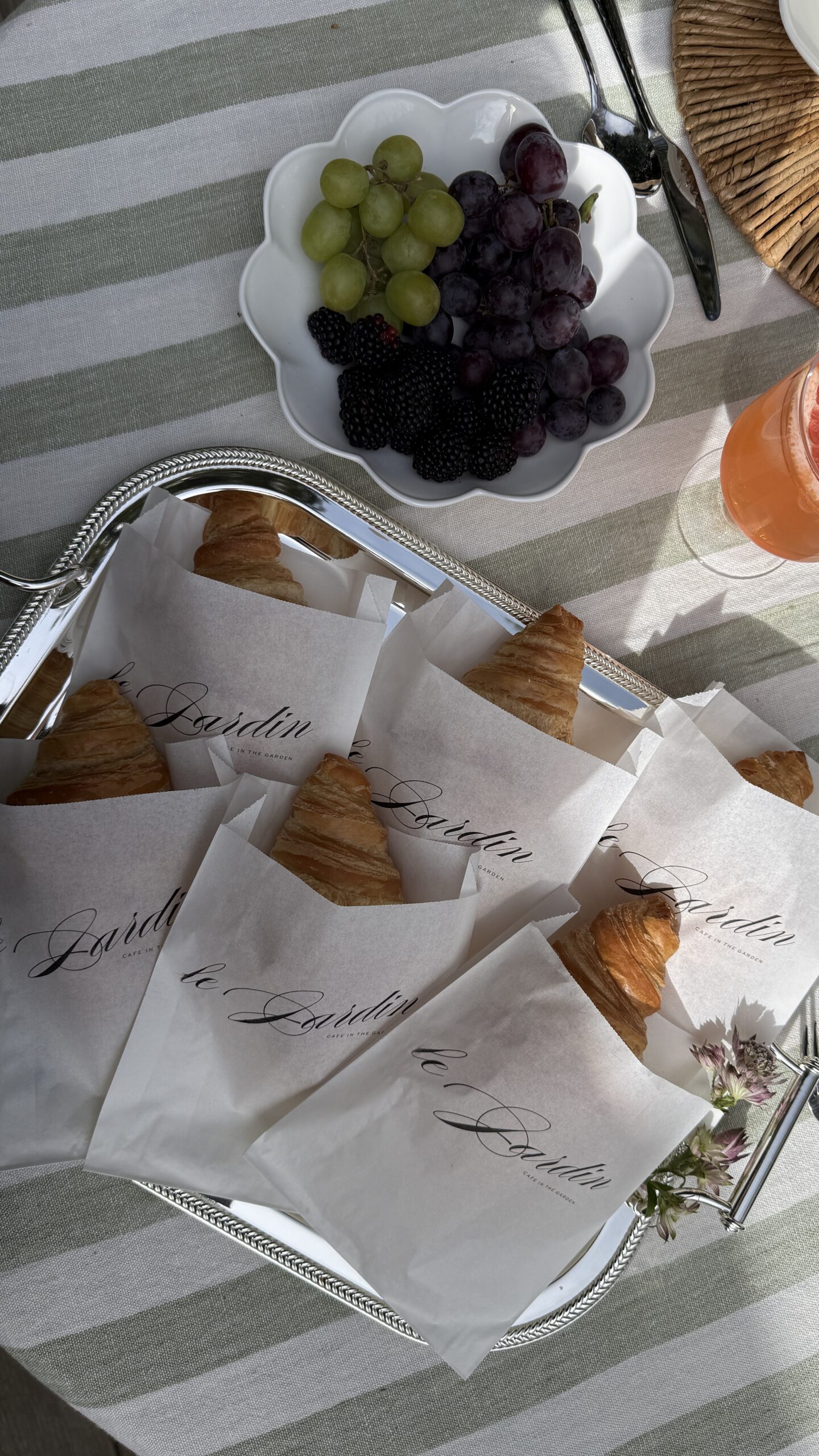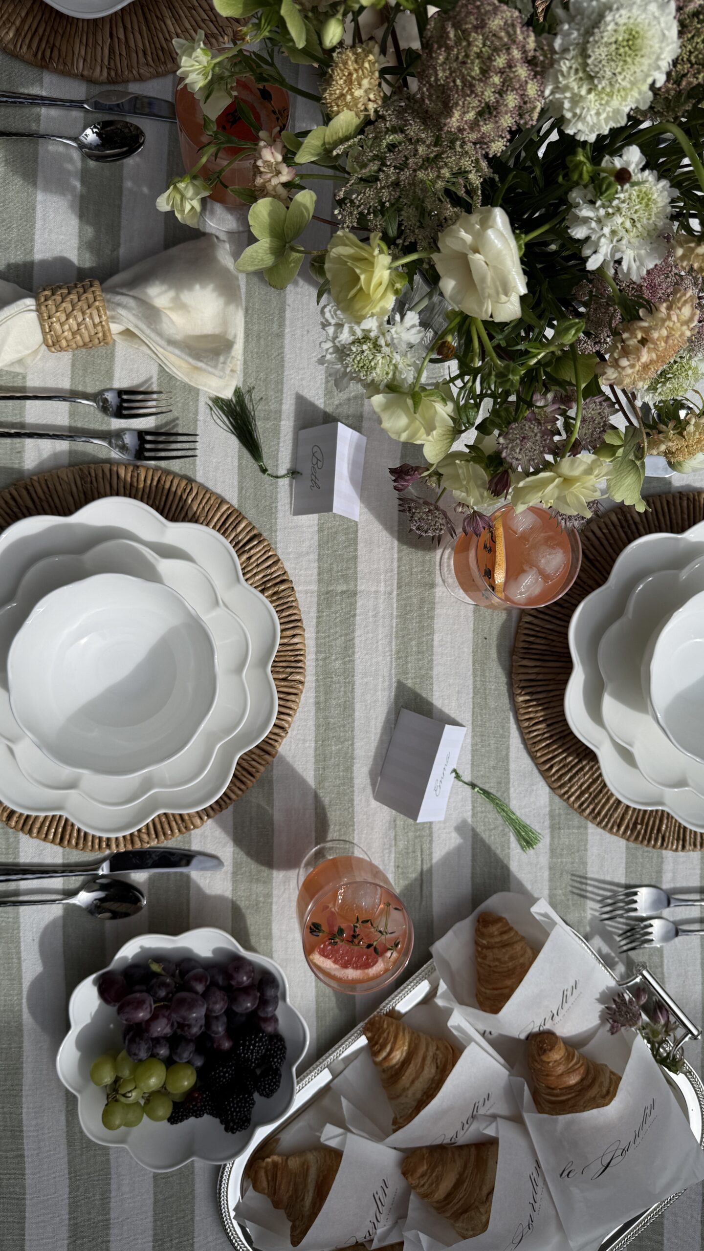 I kept the rest of the table simple and let some other playful details take center stage, like the DIY-tassel name cards and the custom-printed croissant baggies with “Le Jardin” printed on the front. I designed each of these on Canva and used a regular printer for both. I attached these tassels to the name cards (they come in a ton of colors!). For the bags, I taped them to a regular sheet of paper, and fed them through the printer. The trickiest part was getting the text alignment right on the document itself, and then it was easy from there!